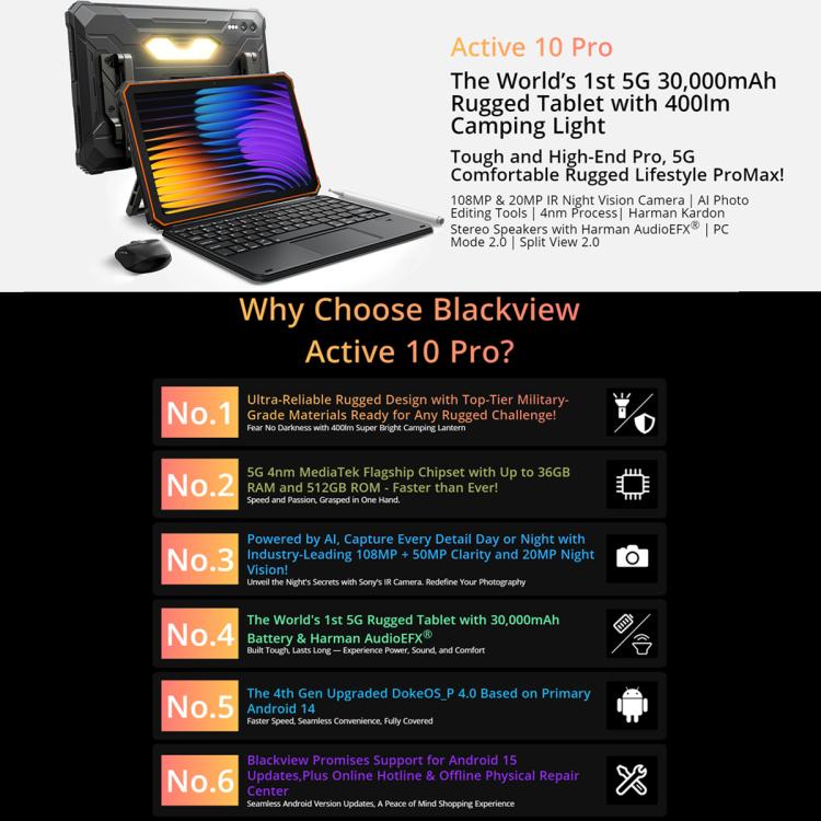 Blackview Active 10 Pro 5G Rugged Tablet, 12GB+512GB, 10.95 inch Android 14 Dimensity 7300 Octa Core, Global Version with Google Play, 12GB+512GB